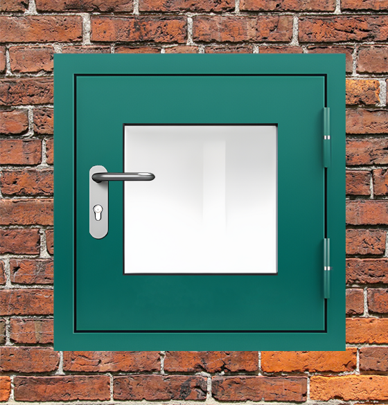 Профессиональное решение для обеспечения пожарной безопасности - люк металлический зеленый с окном и блестящей ручкой с сертифицированными характеристиками надежности.